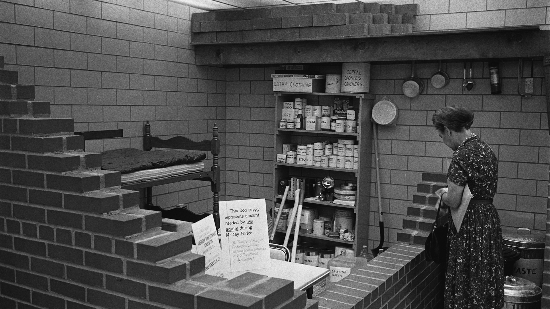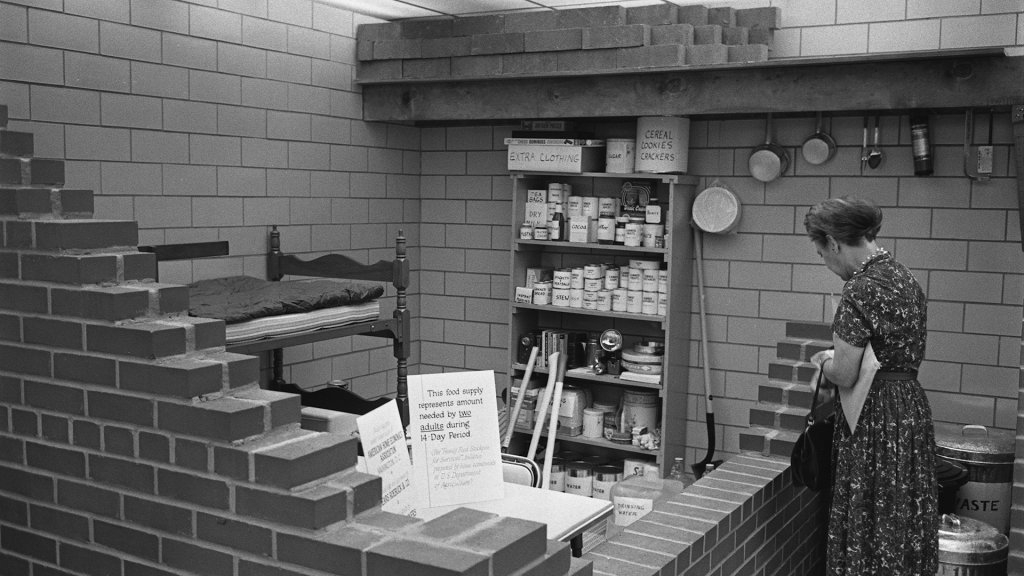 A woman looks at a model of a bomb shelter stocked with food and other supplies, with. A bunk bed in the corner, 1961. A sign reads that the food supply represents amount needed by two adults during 14 day period. Photo by Library of Congress/Interim Archives/Getty Images.