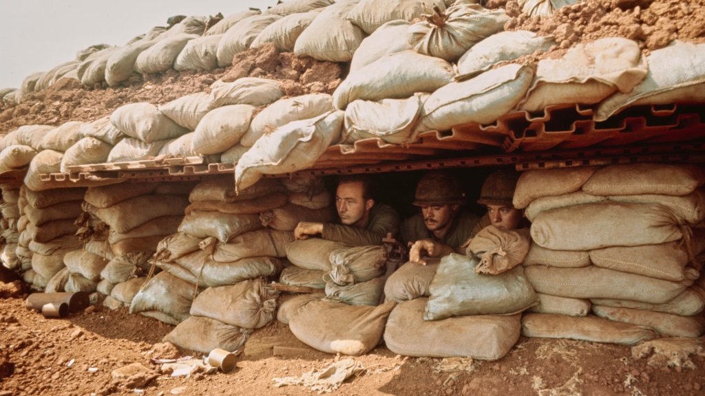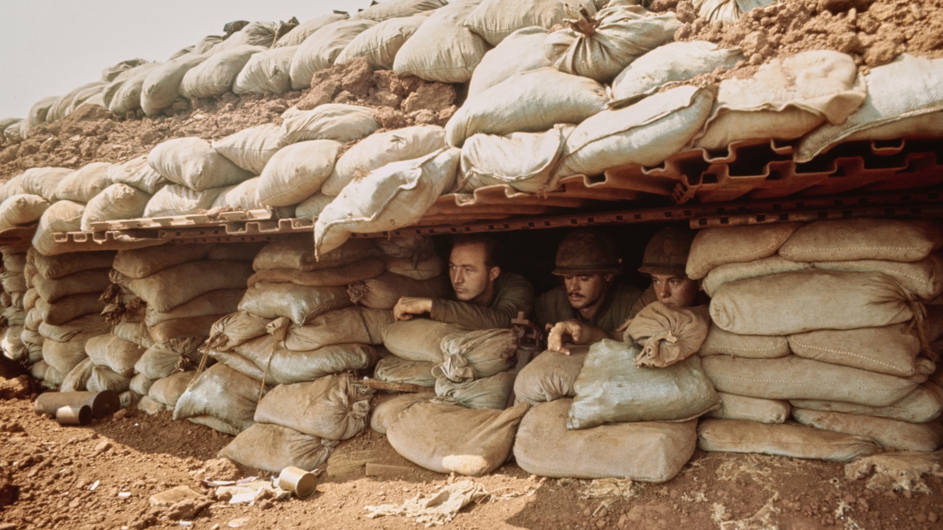 Officers of the United States Marines Corps take shelter in a sandbagged bunker as shelling resumes over Khe Sanh Combat Base, a US Marines outpost south of the Vietnamese Demilitarized Zone (DMZ), in Khe Sanh, South Vietnam, March 1, 1968. (Photo by Bettmann Archive via Getty Images)