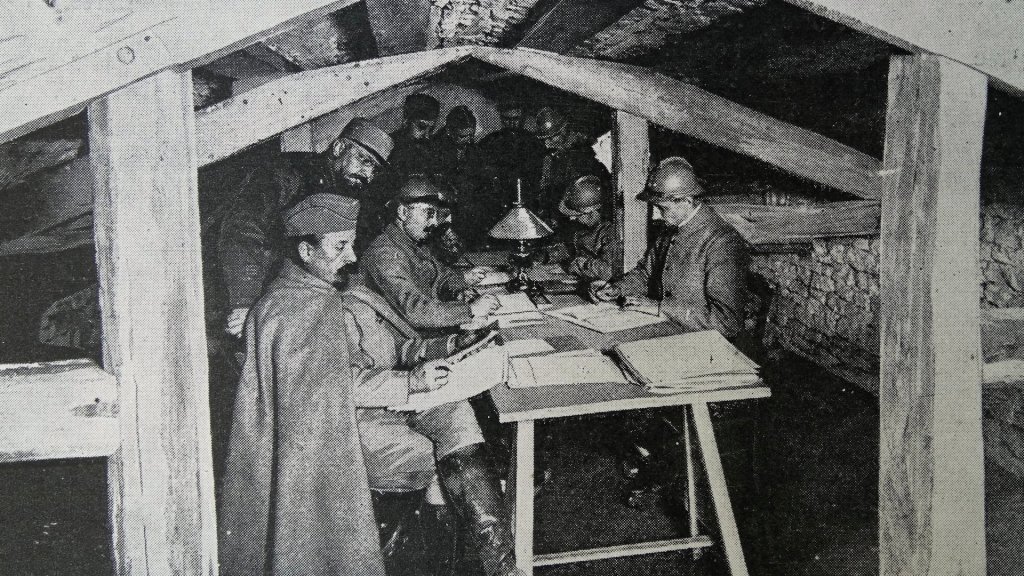 French officers in an underground HQ on the Western Front, during World War I, 1916. Universal Images Group via Getty Images.