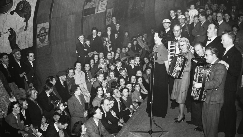 Performance in Aldwych Tube Station, 1940. Members of the public watching a performance by the Entertainments National Service Association, as they shelter from bomb raids in Aldwych Tube Station, City of Westminster, 1940. Photo by © Hulton-Deutsch Collection/CORBIS/Corbis via Getty Images.