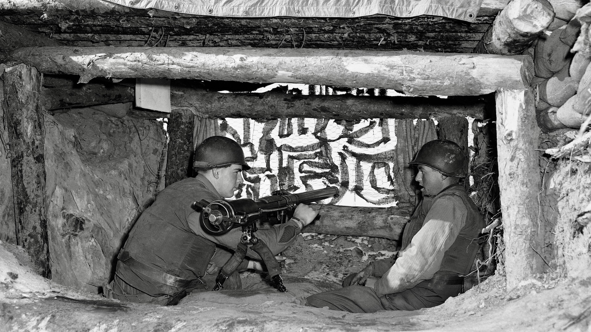 In this photo taken on January 5, 1953, U.S. Army Pfc. Jesse Riffle, of Morgantown, W. Va., and Cpl. James J. Harrington, of Bronx, N.Y., pass the time waiting next to their recoilless rifles in a camouflaged bunker on Old Baldy in Korea. The Associated Press.
