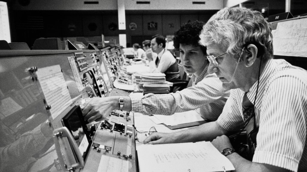 Astronauts Henry W. Hartsfield and Ellen S. Baker monitor data at the flight surgeon’s console in the mission operations control room of JSC’s mission control center during NASA’s mission STS-3, Houston, Texas, March 22-30, 1982. (Photo by Space Frontiers/Getty Images)