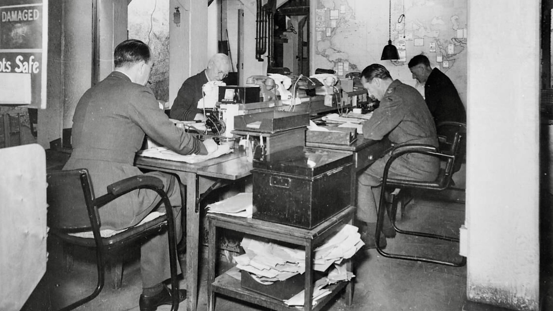 Staff members at work in the Map Room, 1945, part of the Cabinet War Rooms. Located near Downing Street, the Cabinet War Rooms (commonly referred to now as the Churchill War Rooms) served as the U.K. government’s underground headquarters throughout World War II. The Map Room was manned 24 hours a day until shortly after the surrender of Japan in August 1945.