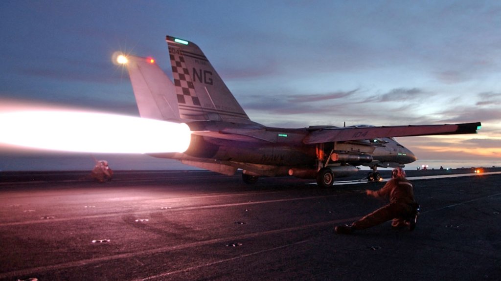 At sea aboard USS John C. Stennis (CVN 74), Jan. 2, 2002 – As the sun rises an F-14 “Tomcat” from the “Checkmates” of Fighter Squadron Two One One (VF-211) goes to full afterburner as it is launched from the flight deck of USS John C. Stennis (CVN 74). Stennis and Carrier Air Wing Nine (CVW 9) are deployed supporting Operation Enduring Freedom. U.S. Navy photo by Photographer’s Mate 3rd Class (AW) Jayme Pastoric. (RELEASED)