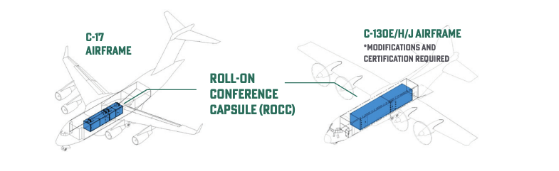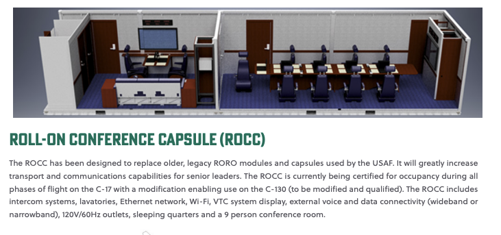 “We are very excited to award this contract and to eventually field the Roll-On Conference Capsules,” Lt. Col. Bena Sellers, Materiel Leader in the Mobility and Training Aircraft Directorate’s C-17 Capabilities Branch, said at the time. “The team has been working on a Silver Bullet replacement for a little over three years now starting with defining the ROCC requirements with the customer. We are looking forward to providing senior leaders with an airworthy product that allows them to stay connected, continuing to execute their mission in flight.”