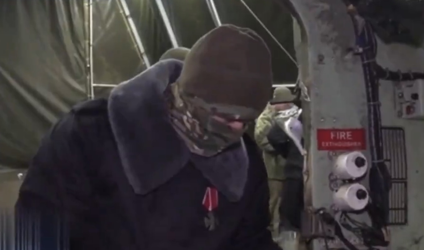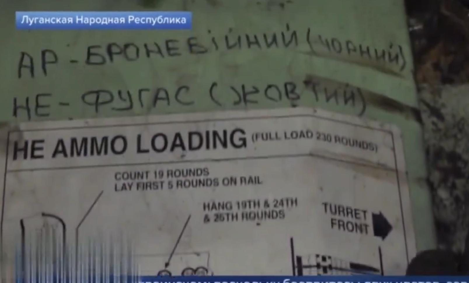 The segment begins with the reporter in the driver’s hatch, later holding up an overlay for switches on the driver’s panel with instructions printed in Ukrainian.