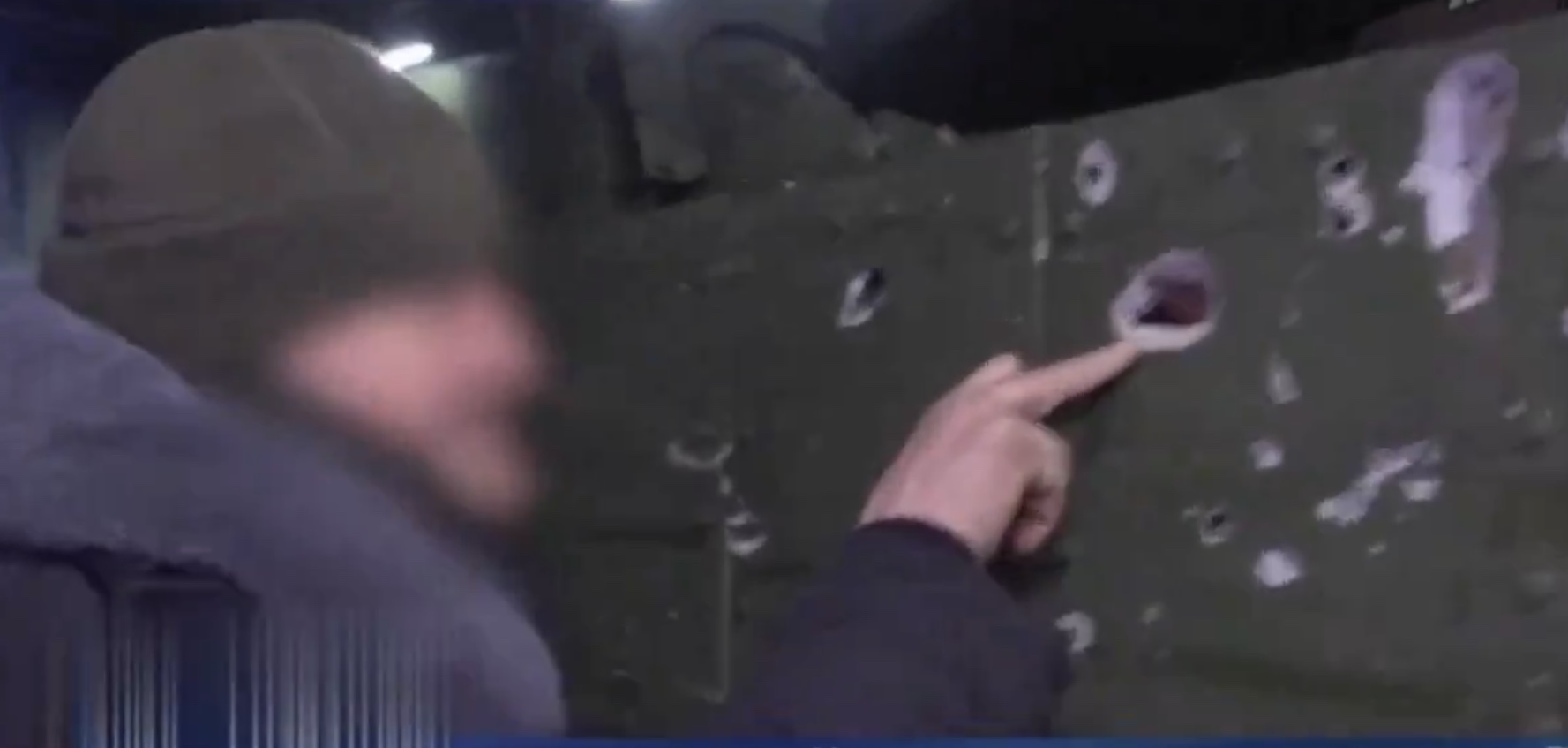 Later in the video points to numerous bullet holes, which the presenter said had been left by Ukrainian forces trying to destroy as much of the hi-tech equipment in the abandoned vehicle as possible.