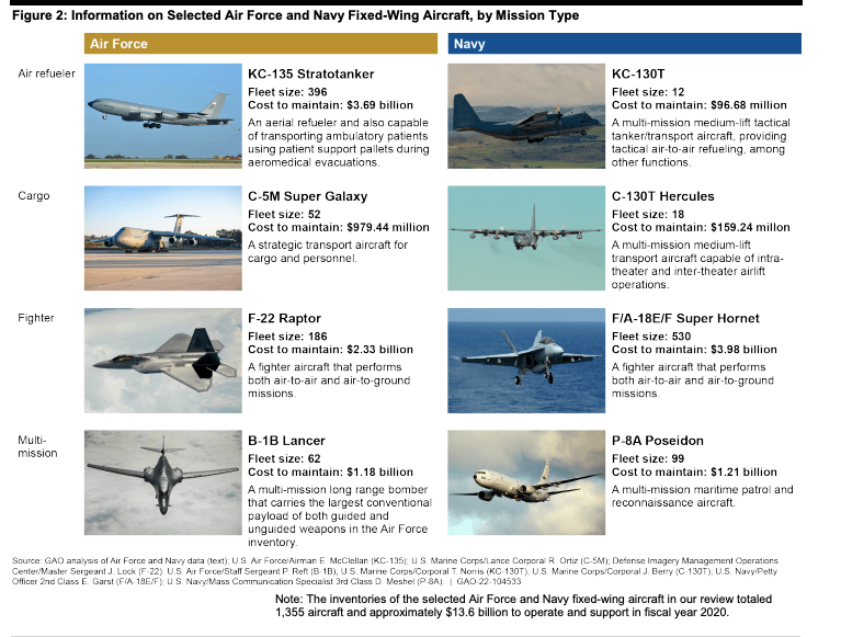 The latest GAO report to examine the U.S. military’s aviation fleet looked into the availability of Air Force F-22 Raptor fighters, B-1B Lancer bombers, C-5M Super Galaxy cargo planes, and KC-135 Stratotanker air refuelers, as well as Navy F/A-18E/F Super Hornet fighters, P-8A Poseiden anti-submarine jets, C-130T Hercules cargo planes, and KC-130T Hercules air refuelers.