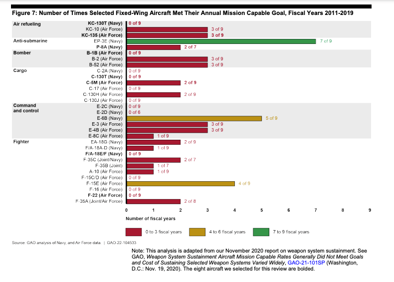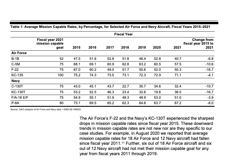 In its latest report, GAO found that between Fiscal Year 2015 and Fiscal Year 2021, the mission capable rates – the percentage of total time when an aircraft can fly and perform at least one mission – have dropped for each one of those aircraft.