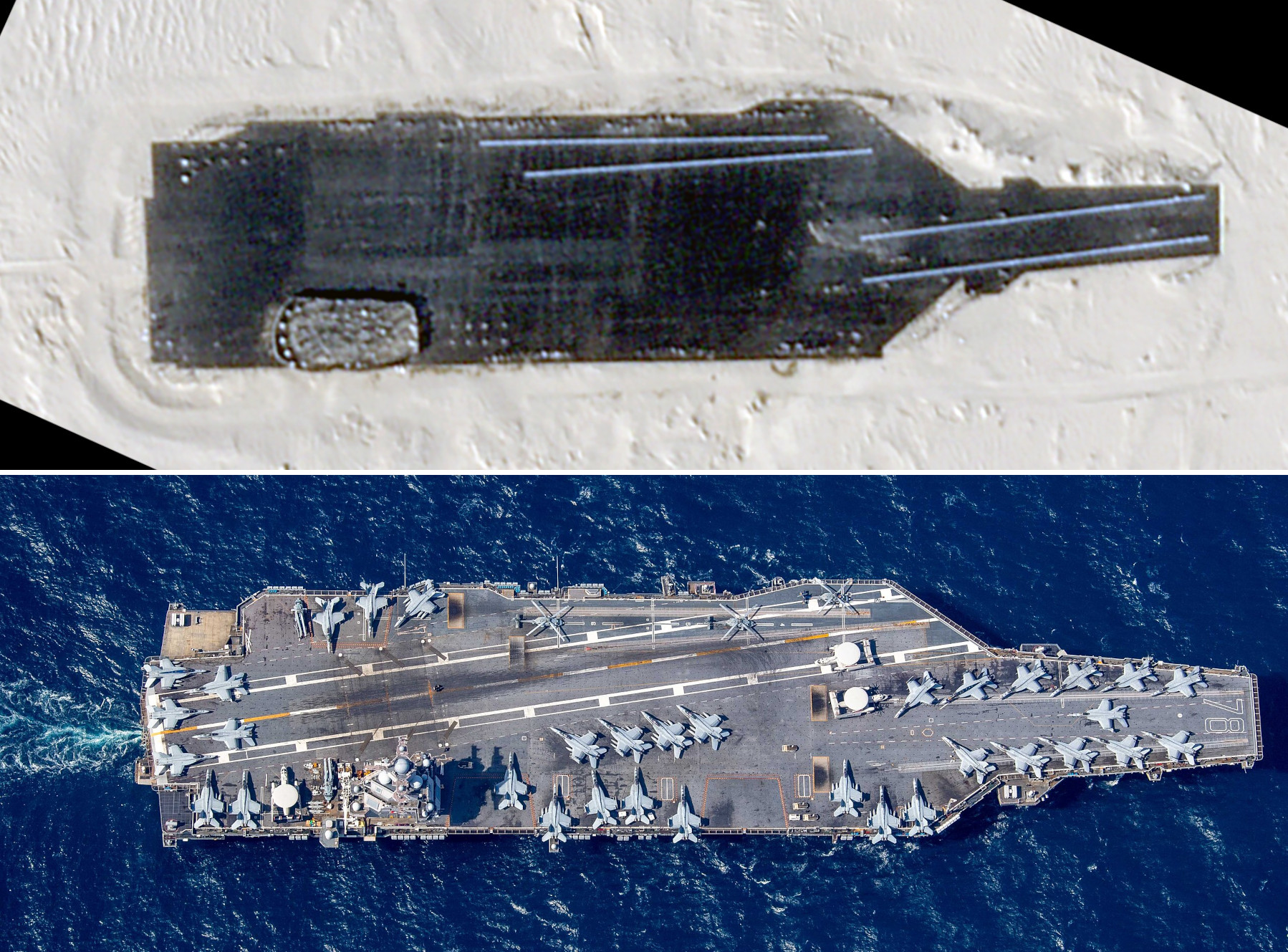 The image of the new carrier target on the range in the Taklamakan Desert in China’s Xinjiang province was taken on January 1 by Planet Labs. A full-scale black-colored silhouette in the shape of the USS Gerald R. Ford, and future carriers in that class, roughly 1,085 feet long, is plainly visible. There is also a structure in the same position as Ford‘s island, as well as four catapult tracks marked on the ‘deck’ in the same places they appear on the real ship. The unique sponsons and other outcroppings, including a broader, squared-off stern, that are found on the Ford are also present in the target silhouette.
