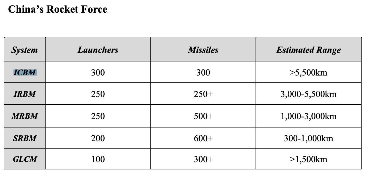 The Pentagon estimates that China currently has approximately 300 total ICBMs in its rocket force, including those used by both fixed and mobile launchers.