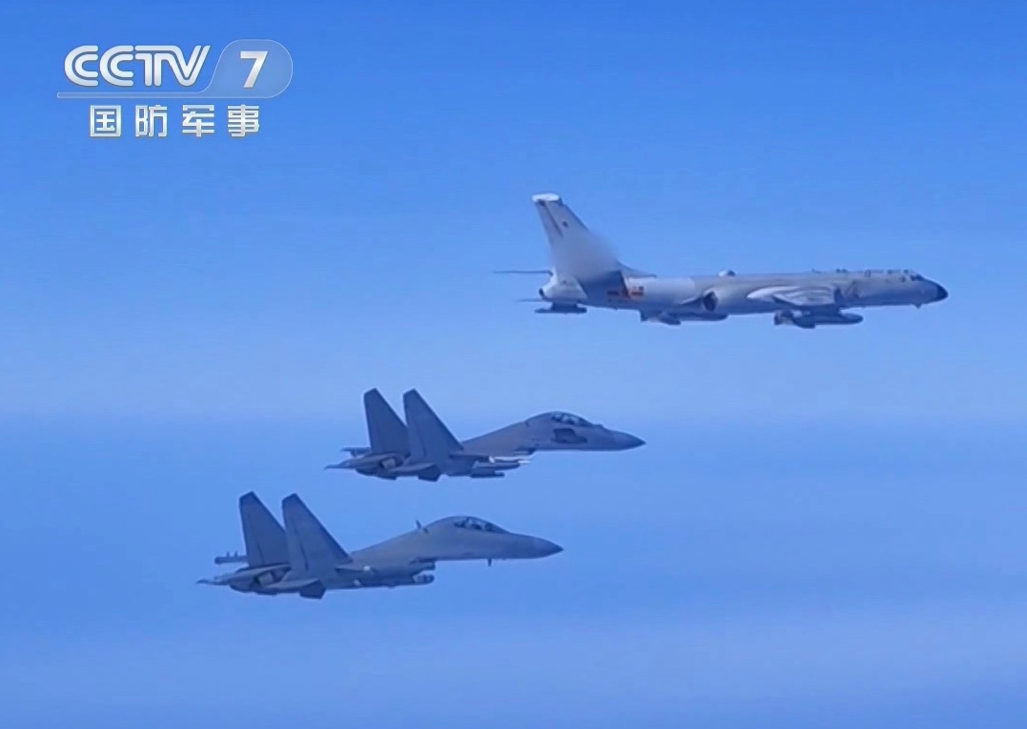 In one video released by the Eastern Theater Command on its WeChat instant messaging account, an H-6 bomber was shown flying over what was described as airspace north of Taiwan.