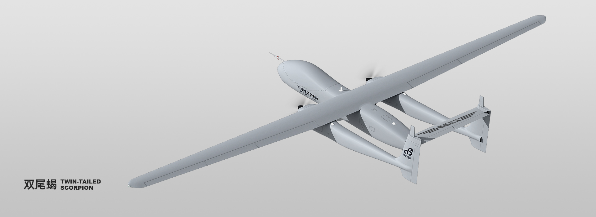The TB-001 Scorpion features a twin-boom tail similar to the Scorpion D but is instead powered by only two single propellor engines on either side of its fuselage under its straight, high-mounted main wing. The company has also produced a three-engine variant of the inaugural Scorpion meant to improve “wide-area deployment, short take-off and landing, high-altitude performance, [and] high-power power supply capability,” according to the company.