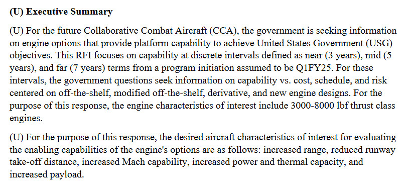The Air Force Life Cycle Management Center at Wright-Patterson Air Force Base in Ohio recently put out an unclassified Request for Information (RFI) relating to the Collaborative Combat Aircraft (CCA) program, which contained information about the engine and other requirements.