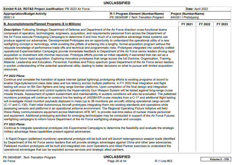 The Air Force’s proposed budget for the 2023 Fiscal Year asks for almost $89.1 million to support various “lifecycle prototyping” activities, including the construction of “a C-130 transportable/deployable Hypervelocity Ground Weapon System (HGWS) prototype.” It is unclear how much of that funding is expected to go to the HGWS effort specifically.