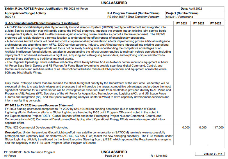 After this story was published, a reader alerted us to an additional section within the Pentagon’s overall 2023 Fiscal Year budget request related to the HGWS. The Office of the Secretary of Defense’s Strategic Capabilities Office (SCO) is seeking $151 million to support HGWS development as part of a larger portfolio of work on what are described as “Advanced Innovative Technologies.” It also notes that SCO received $3 million and $20 million in funding for HGWS research and development in Fiscal Years 2021 and 2022, respectively.