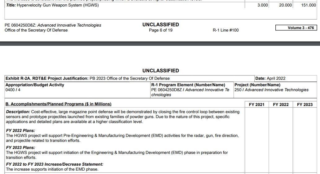 “The HGWS project will support initiation of the Engineering & Manufacturing Development (EMD) phase in preparation for transition efforts,” it says in describing the goals for the upcoming 2023 Fiscal Year.