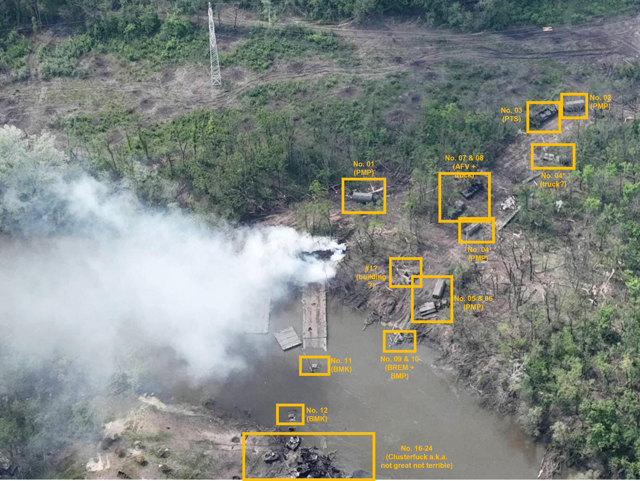 Numerous Russian tanks and other armor were destroyed or abandoned after being attacked by Ukraine while trying to cross the Donets River. (Twitter via @Blue_Sauron)