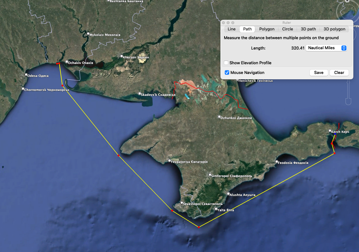 It is roughly 320 nautical miles (368 miles) from the closest Ukrainian-controlled shore to the Kerch Bridge, taking the most direct route around Crimea to the bridge. That is a very long-range strike that is unprecedented for Ukrainian USVs used against littoral targets. If the attacks on Russian vessels deep to the south in the Black Sea are indeed as Russia has purported them to be, such a long-range capability has been demonstrated. There is also the possibility that they were clandestinely launched much closer via a mothership vessel, but there is no evidence of that at this time.
