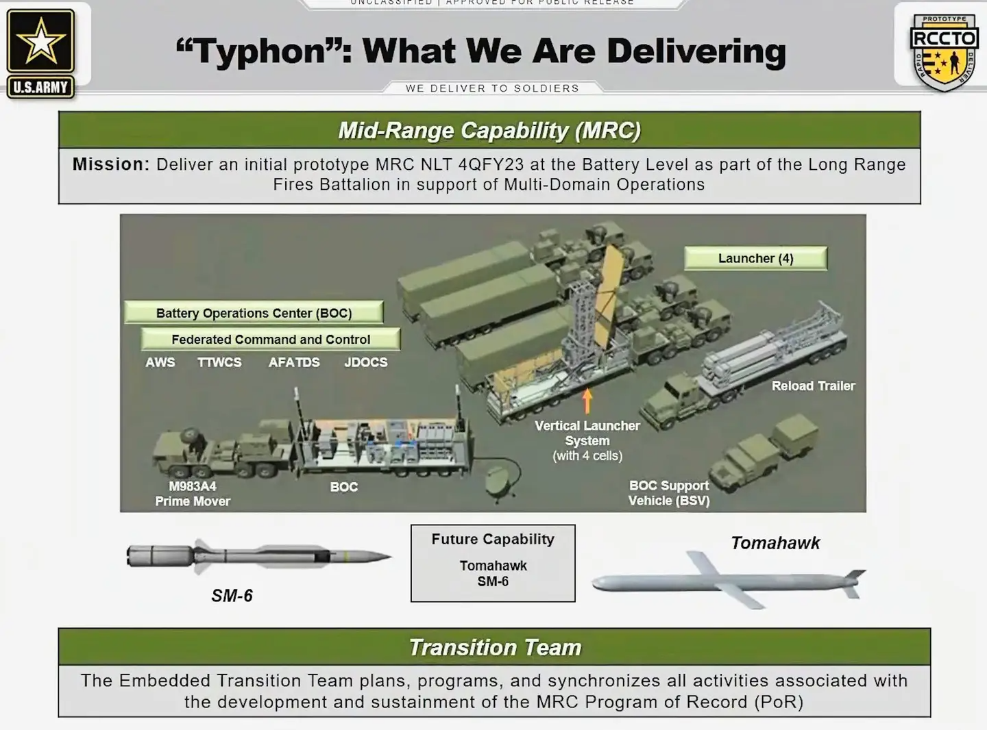 The Army Rapid Capabilities and Critical Technology Office (RCCTO), which is currently managing the Mid-Range Capability (MRC) program, accepted delivery of the first complete Typhon Weapon System (TWS), but a corresponding Army announcement did not detail when exactly this occurred. However, according to Lt. Gen. Robert Rasch, director of the Army RCCTO, the team was able to take the MRC concept from idea to delivery in just over two years so that training with the system could begin as soon as possible.