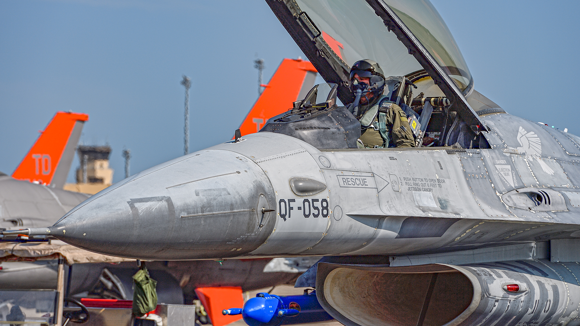 “We regularly fly in the cockpit of the QF-16, but with the aircraft under the control of an X-ray pilot. The only difference from a full-up NULLO is that the remote pilot does not have control of the brakes or the nosewheel steering to help mitigate risk. We sit there, with our hands off the controls, while the remote pilot practices maneuvers, recovering from unusual attitudes, that kind of thing. Sitting in the jet, we do have a paddle switch that means we can take control of the airplane. It’s a very weird feeling sitting there while the jet is being flown remotely!”
