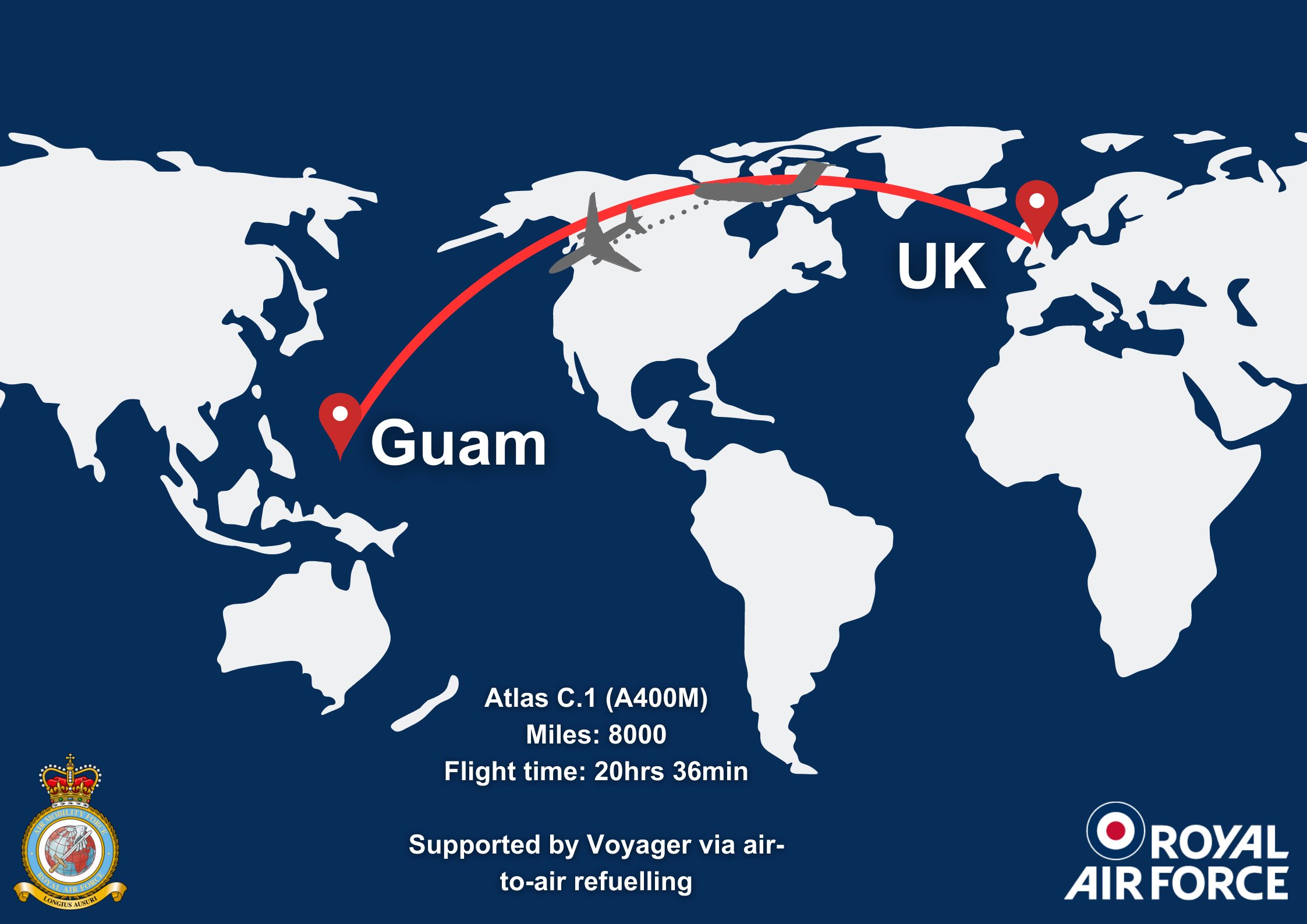 “The non-stop flight of the A400M Atlas from RAF Brize Norton to Guam is a great example of our ability to project air power, allowing us to get aircraft, crews and vital equipment to the other side of the world in a timely manner and for them to be able to operate immediately,” said Air Commodore Anthony Lyle, the RAF’s Air Mobility Force commander.