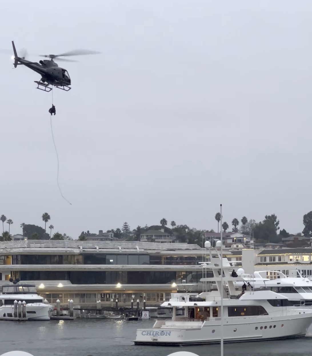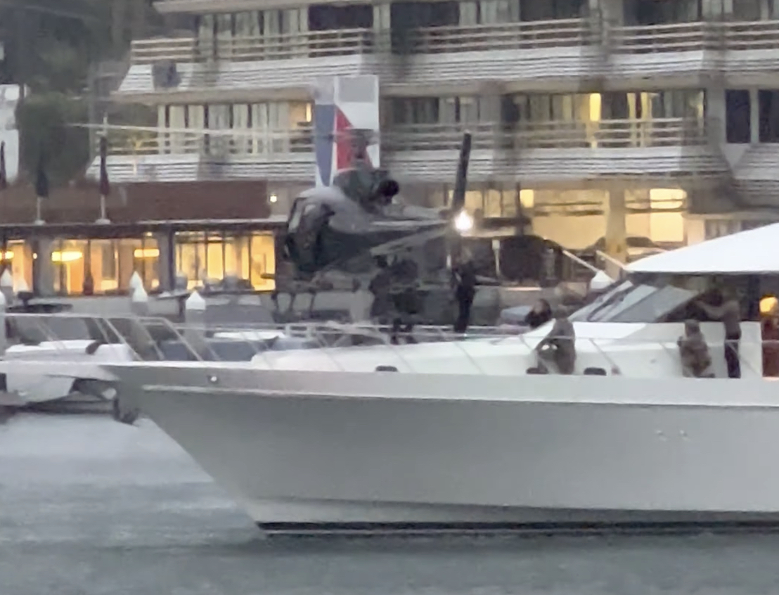 Shorter clips, including footage of the initial rappelling and the helicopter circling the yacht, were also posted to YouTube by the same user. Below, a video of the AS350’s final descent was captured by an individual from a different vantage point at the Marina.