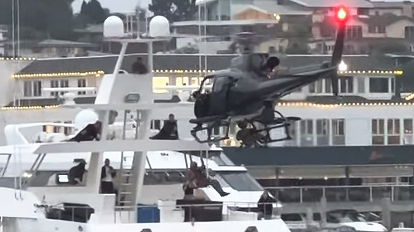 Then, a third individual begins to maneuver out of the helicopter, dangling in the air as the aircraft slowly descends. Displaying amazing levels of control, North safely allows the individual to lower themselves onto the yacht’s rear deck.