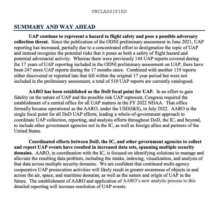 But you won’t be able to find many answers to those questions in this 12-page report, an unclassified version of the document delivered to Congress on Wednesday that was compiled by the Pentagon’s newly formed All-Domain Anomaly Resolution Office (AARO) and ODNI’s National Intelligence Manager for Aviation (NIM-Aviation). “Many” of the cataloged cases, it notes, “remain unresolved” because a large number “lack enough detailed data to enable attribution of UAP with high certainty.”