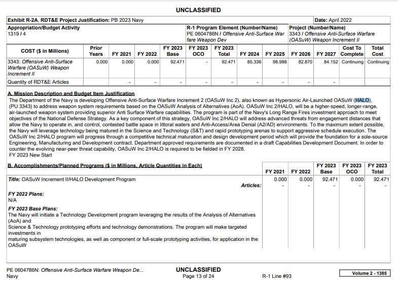 Details about what the Navy is now formally calling the Hypersonic Air-Launched Offensive Anti-Surface Warfare missile, or HALO, are contained in recently released documents related to the service’s latest budget request for the 2023 Fiscal Year. This program was previously known as Offensive Anti-Surface Warfare Increment 2 (OASuW Inc 2). OASuW Increment 1 is the existing AGM-158C Long-Range Anti-Ship Missile (LRASM), a subsonic design.
