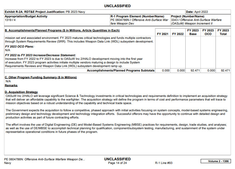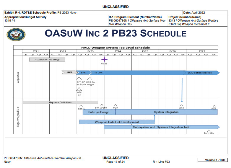 “OASuW Inc 2/HALO will address advanced threats from engagement distances that allow the Navy to operate in, and control, contested battle space in littoral waters and Anti-Access/Area Denial (A2/AD) environments,” one budget document says. “In order to counter the evolving near-peer threat capability, OASuW Inc 2/HALO is required to be fielded in FY 2028.”