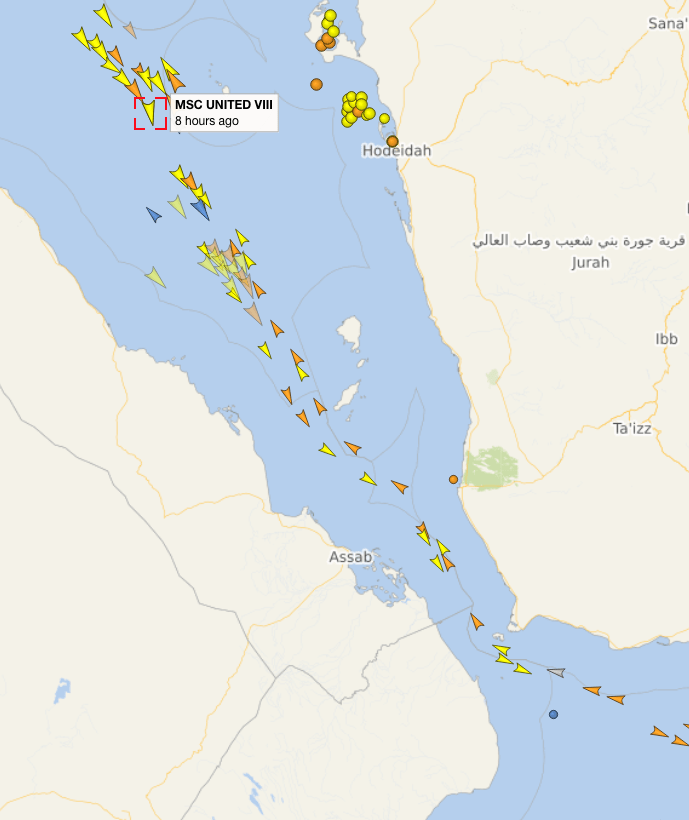 The last AIS position of the vessel was eight hours ago as it approached the southern end of the Red Sea: