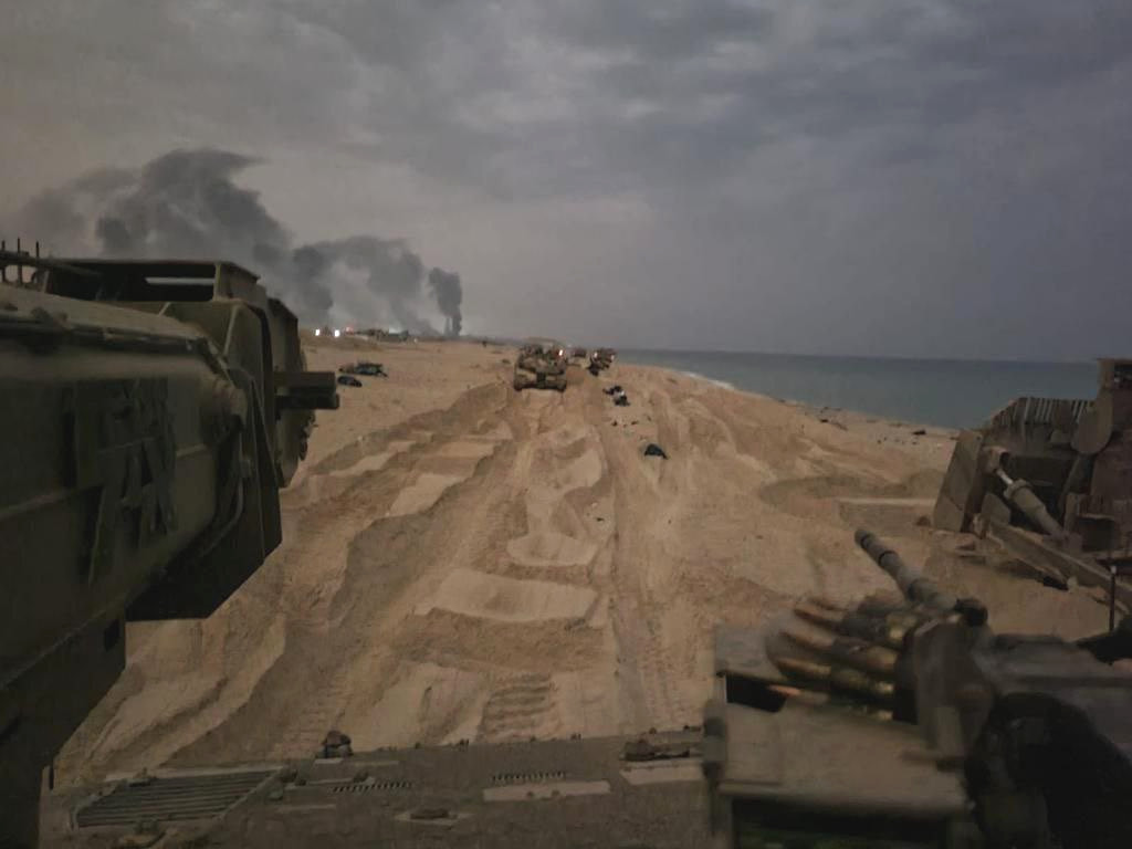 The IDF has published imagery of its operations in Gaza, including shots of Merkeva tanks and armored vehicles rolling on the beach in northern Gaza (seen at the top of this article and below). Some of the Merkavas have add-on cage-type armor on top of their turrets, primarily intended to protect against weaponized drones, which you can read more about here.