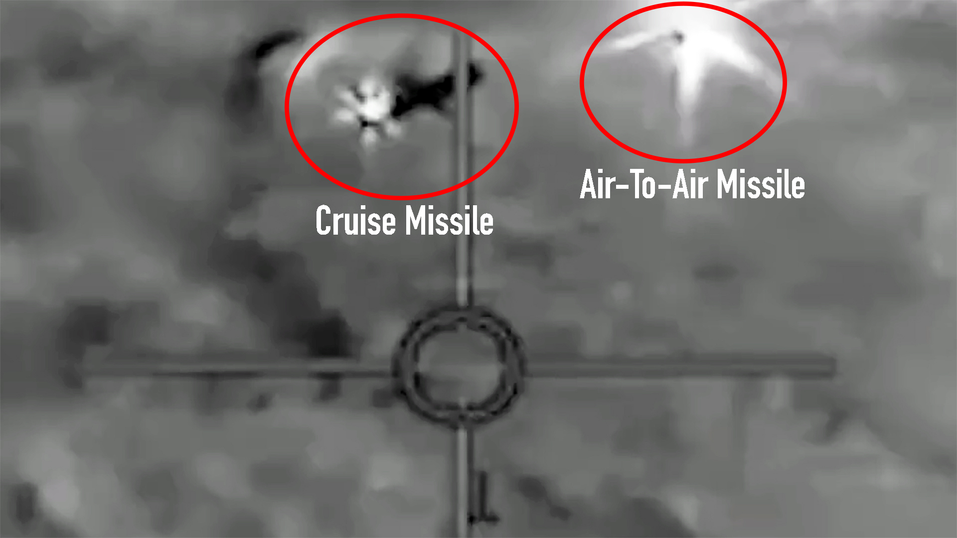 A brief video accompanying the tweet shows footage apparently gathered from an F-35I’s helmet-mounted display (or perhaps from its Electro-Optical Targeting System), clearly showing a jet-propelled winged cruise missile in the crosshairs. The moment of launch of what is almost certainly an AIM-9X Sidewinder infrared-guided missile can be seen, with what appears to be a shower of sparks and debris coming close into the frame as the missile leaves the wing. That weapon then makes a hard left turn before impacting the target. This looks to be a good example of the AIM-9X’s high off-boresight engagement capabilities.