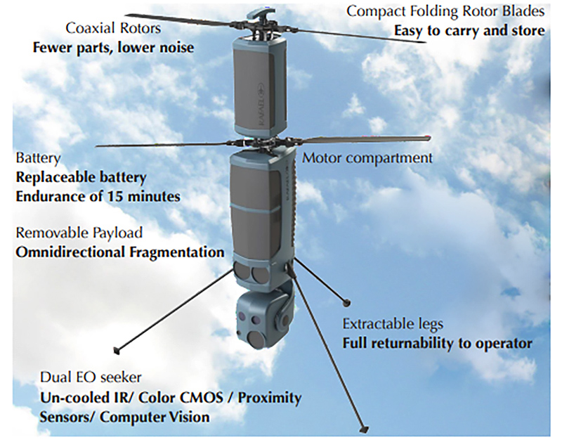 FireFly is part of Rafael’s SPIKE family of precision-guided munitions, sharing guidance and other components from the SPIKE NLOS (non line-of-sight) missile. The vertical take off and landing (VTOL) drone is designed to offer beyond-line-of-sight (BLOS) lethality by operating both via within line-of sight operator-in-the-loop control, as well as autonomously via flying on autopilot to waypoints. It has a dual infrared and electro-optical (EO) seeker as well as proximity sensors. The weapon is capable of running down “agile targets” and it can fly inside windows and doors to strike enemies behind cover.
