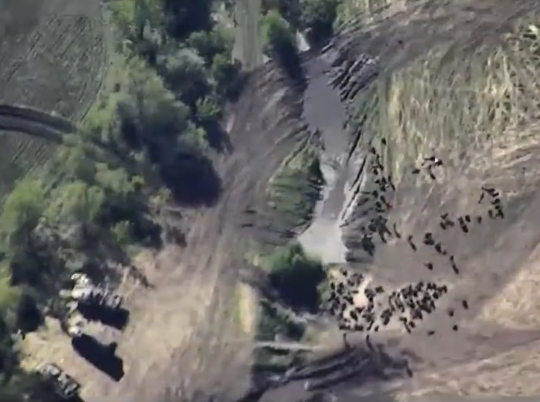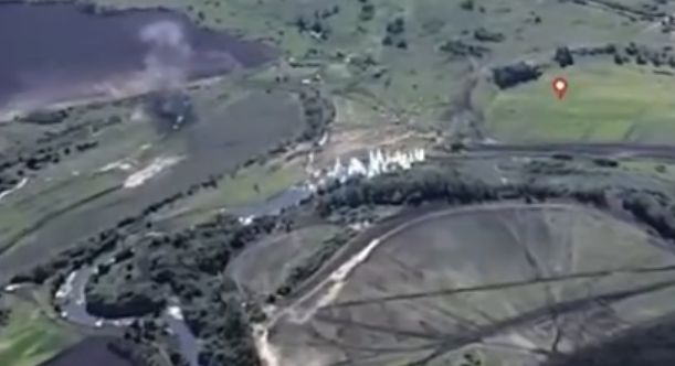 At the 37-second mark the surveillance drone zooms onto a concentration of Russian troops and at least three armored vehicles.