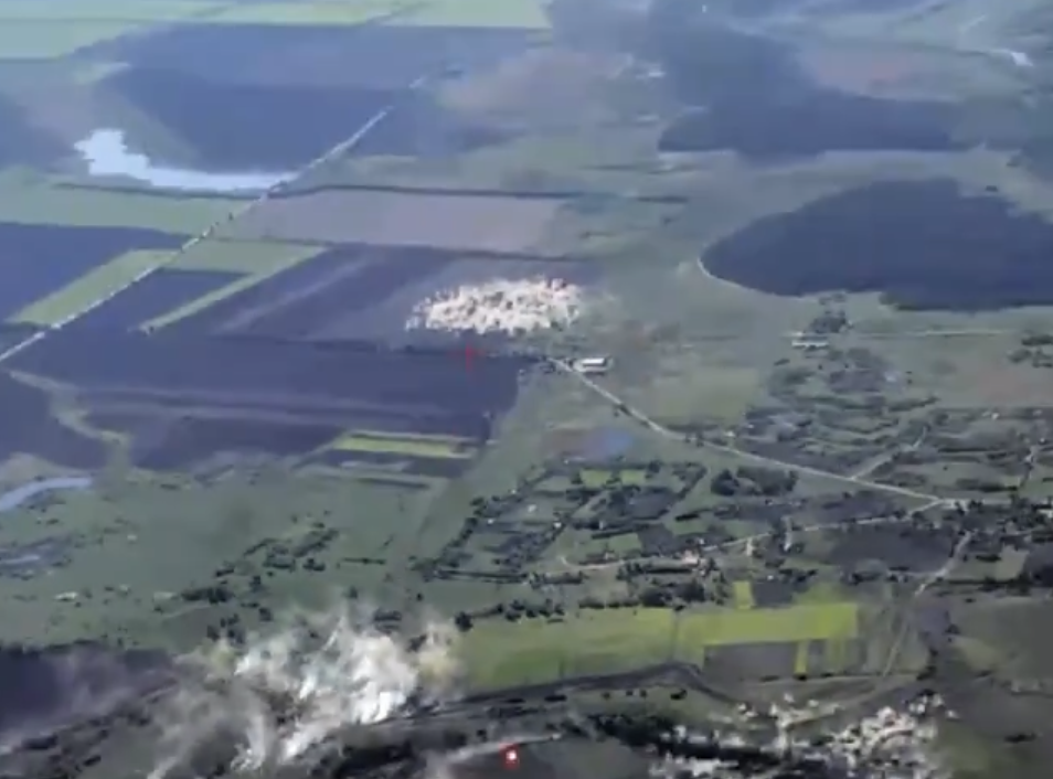 The first of three explosions that blanket the area, showing the tell-tale plumes of smoke from the submunitions being scattered and detonating, can be seen at about the 4-minute mark.