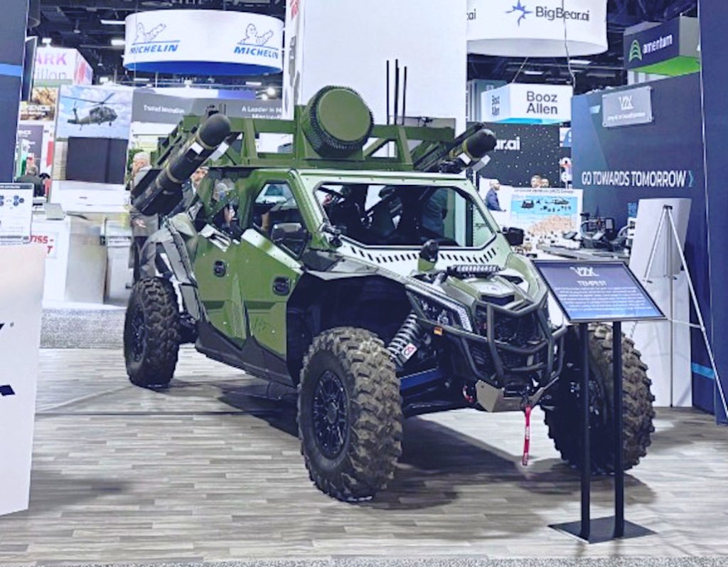 V2X first unveiled Tempest at the Association of the U.S. Army’s (AUSA) main annual convention in Washington, D.C., last October. The configuration that has been seen to date, including in Ukraine, consists of a pair of launch rails for Hellfire missiles and a small form factor active electronically scanned array (AESA) radar mounted on what looks to be a modified Can-Am Maverick X3 4×4 off-road buggy.