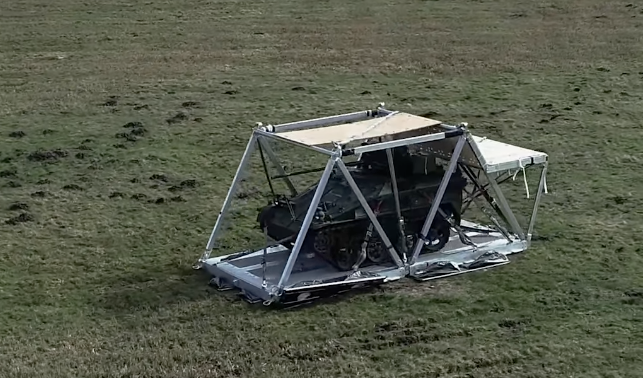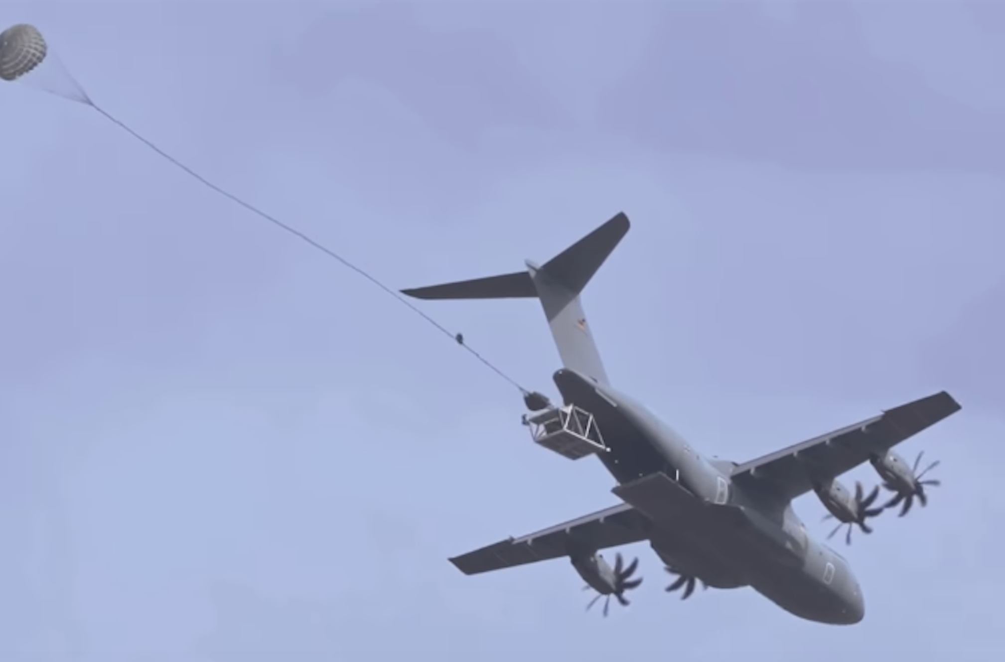 The video shows the tracked Wiesel first being loaded into the hold of an A400M within its ‘cage,’ the ATAX parachute system from the British manufacturer IrvinGQ. The load is then rolled off the aircraft’s rear ramp and descends under three parachutes. Reusable shock-attenuating airbags under the cage provide a softer touchdown. Soldiers then drive the vehicle directly off the pallet, without any significant preparation.