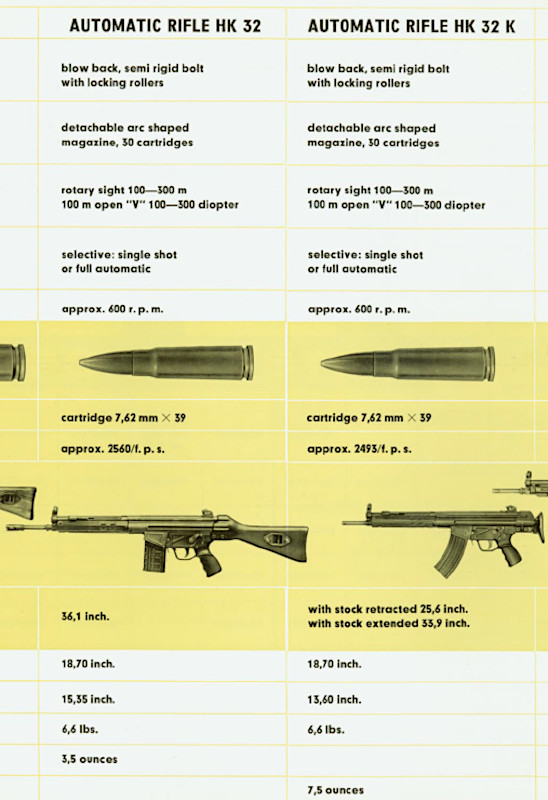 Even during the Cold War, there was the potential for contracts to supply the militaries and other security forces of ostensibly non-aligned countries with new small arms. Offering guns in Soviet-designed calibers those nations might already have in their inventories was one potential path into those markets. During the 1950s and 1960s, at least, H&K included full-size rifles and compact carbines chambered in 7.62x39mm, the HK 32 and 32K, alongside guns in NATO calibers in its catalog. The company may have pitched versions of the magazine and belt-fed automatic rifles/light machine guns it sold at the time in the Soviet caliber, as well.