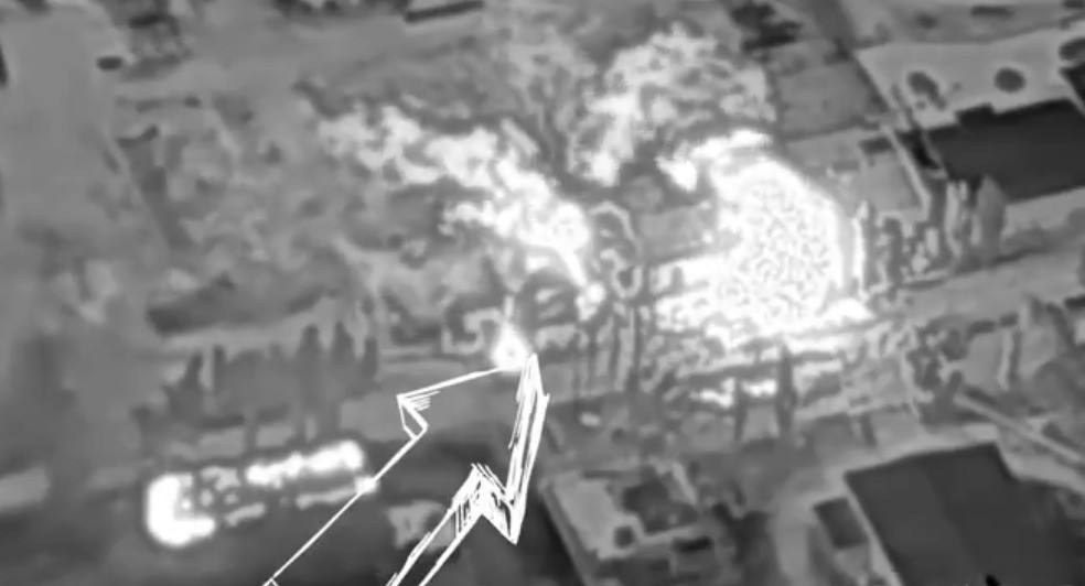 A superimposed arrow purportedly points to the burning M270, where nearby secondary explosions can be seen.