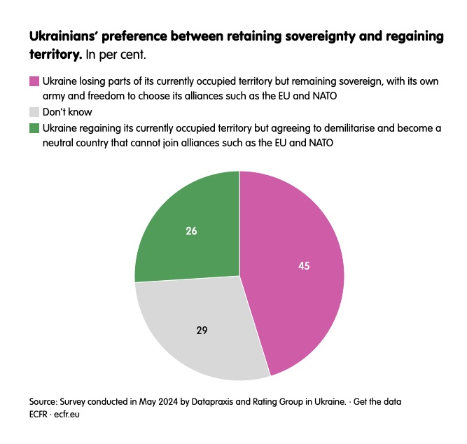 In addition, “Ukrainians appear to view the right to choose their geopolitical orientation as even more important than territorial integrity,” ECFR explained. A full “45% say they would prefer Ukraine to lose parts of its currently occupied territory but remain sovereign, with its own army and freedom to choose its alliances, such as the EU and NATO. Only 26% say they would prefer to see Ukraine regain its occupied territory but accept demilitarisation and neutrality, which would mean not joining the EU and NATO.”