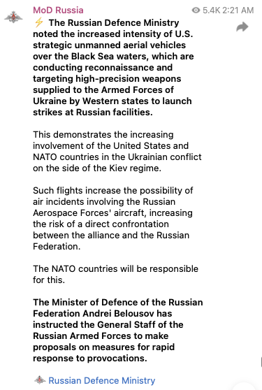 The Russian Defense Ministry (MoD) on Friday issued an ominous yet unspecified warning to the U.S. and NATO about what it claims is the increasing frequency of drone flights over the Black Sea. Those flights are being used to help Ukrainians hit Russian targets, the MoD claimed.