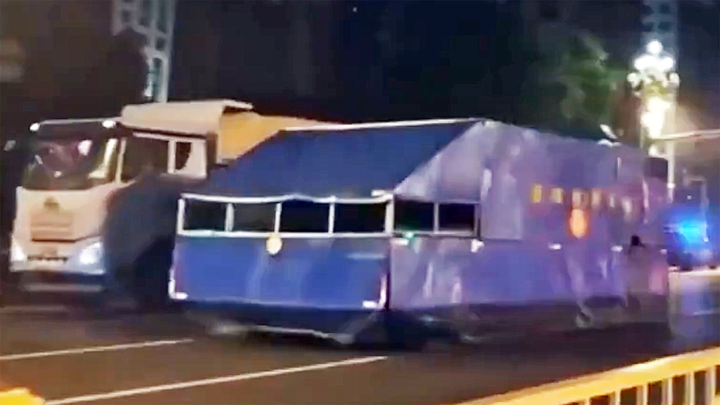 At least four of the odd-looking vehicles are seen moving, at night, along a portion of an apparently closed-off road. Each of the vehicles, with their blue-painted coverings, is closely accompanied by a standard truck. It’s possible that those white trucks are serving to further conceal the covered vehicles from closer inspection, although that cannot be confirmed. They may also be close by to provide additional instructions to the drivers of the mystery vehicles, as well as illuminating the road with their headlamps.