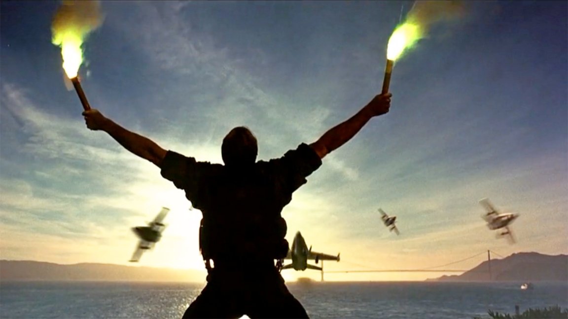 A Blue Angels practice session filmed from Alcatraz evoked the finale of Michael Bay's 1996 blockbuster in spectacular fashion.
