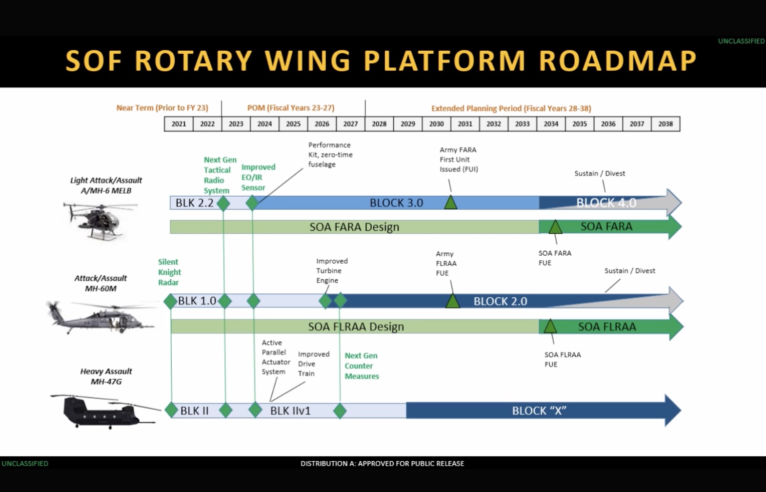 In 2034, the same year it will field FARA, SOCOM will introduce the Block 4 configuration for Little Bird, or some version of that aircraft. Downer told Defense News that a hybrid engine could boost the Little Bird’s speed by slowing the rotor blades during cruise flight to reduce drag, but no such upgrade was noted on SOCOM’s aviation modernization timeline.