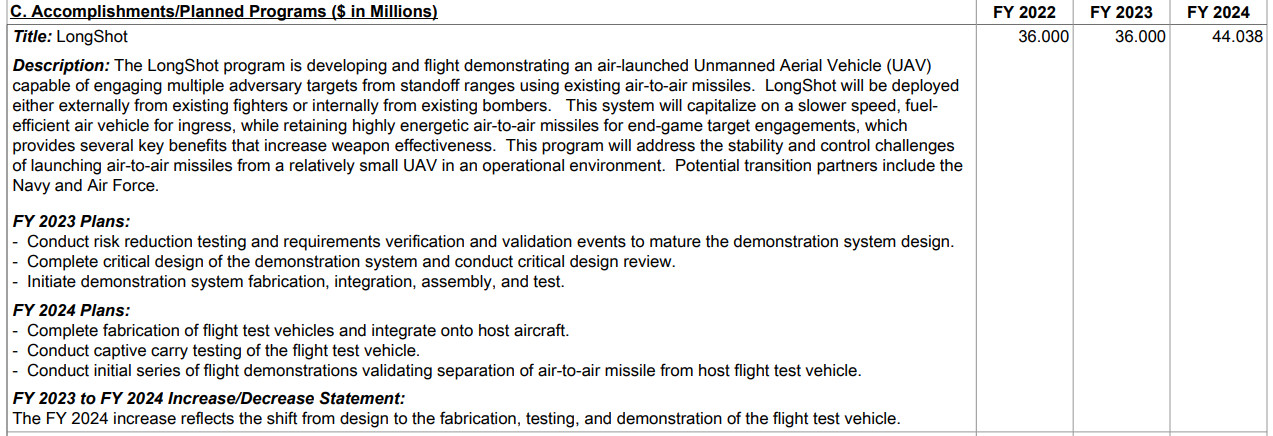 “The LongShot program is developing and flight demonstrating an air-launched Unmanned Aerial Vehicle (UAV) capable of engaging multiple adversary targets from standoff ranges using existing air-to-air missiles,” according to the entry for the program in the Pentagon’s 2024 Fiscal Year budget proposal, which was released in March. “LongShot will be deployed either externally from existing fighters or internally from existing bombers.”