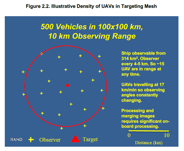 “We looked at eight different classes of radios in different frequency bands, we looked at different jamming threats in terms of their proximity and intensity, and so forth in the Strait, and we concluded that in the 5G band and the high 5G band, even very intensive comm jamming can’t prevent the UAVs in the mesh from communicating, from linking with one another,” Ochmanek continued. “And we’re talking about a density in which there’s never more than 10 kilometers [just over 6 miles] between UAVs in that mesh. So that 10-kilometer link distance was our threshold value and we’re quite confident that, even with fair low power off-the-shelf radios, you can sustain that level of connectivity even in the presence of highly powerful jammers.”