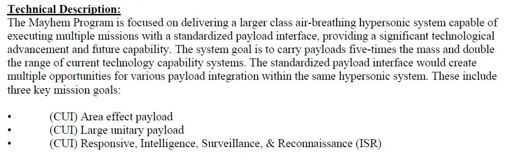 “The initial task order is $24 million to conduct the System Requirements Review (SRR) and Conceptual Design Review (CoDR) in a Digital Engineering (DE) environment,” according to a separate press release from Leidos. “The Mayhem system will use a scramjet engine to generate thrust, propelling the vehicle across long distances at speeds greater than Mach 5.”