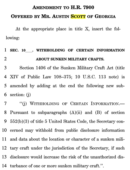 “This amendment would allow service secretaries to withhold information about the location of Sunken Military ships and aircraft from public disclosure,” reads the summary of the amendment. “Scrappers are filing FOIA [Freedom of Information Act] requests to get the locations of sunken ships in order to remove the steel for its scrap value.” At the same time, the actual language reads, in part: